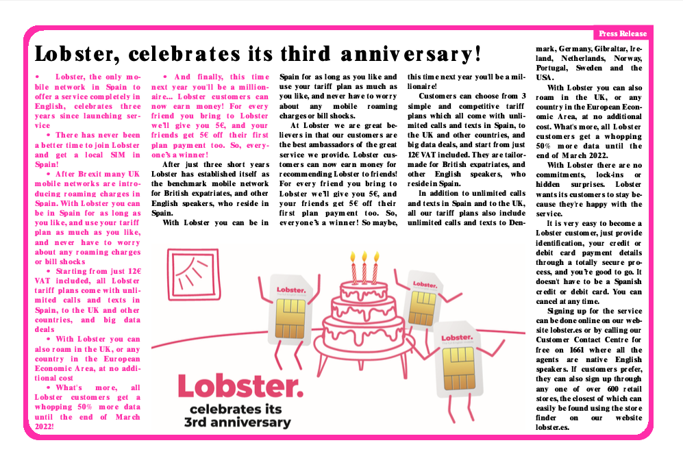 Madrid 18th December, 2021. Lobster, the only mobile network in Spain to offer a service completely in English, celebrates its third anniversary today! After just three short years Lobster has established itself as the benchmark mobile network for British expatriates, and other English speakers, who reside in Spain.