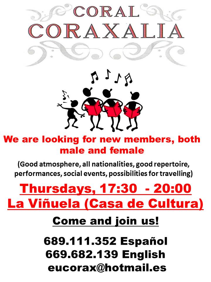 Do you like singing? Would you like to join a choir? We are inviting new singers to become members of the local, long-established choir, Coral Coraxalia under the leadership of Eusebio Pita. Great, friendly atmosphere, all nationalities, good repertoire, performances and concerts, social events, possible touring, etc. Rehearsals Thursdays 17.30 – 20.00 in the Casa Cultura on the main A7205 road at Viñuela village. Plenty of free parking opposite . Come along to a rehearsal and hear us and decide if you’d like to join us! For more information call 669 682 139 English / 689 111 352 Spanish. READ MORE